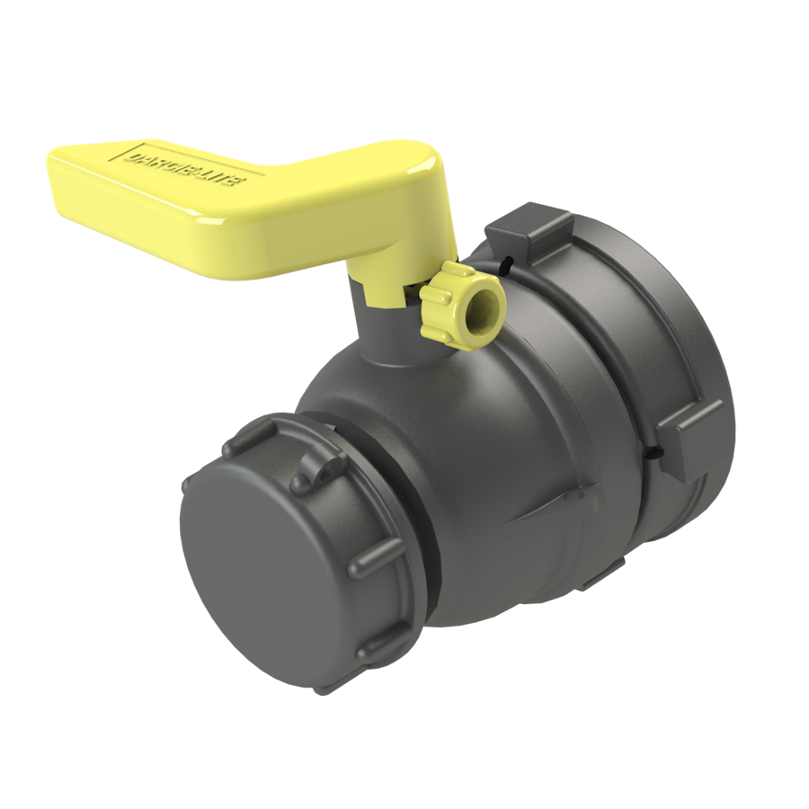 2" 'DARCIE-LITE' IBC ball valve, S75X6 female buttress in-let x 2" NPT male, C/W dust cap, BLACK,, YELLOW handle CPP logo G/P/P