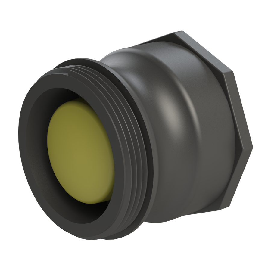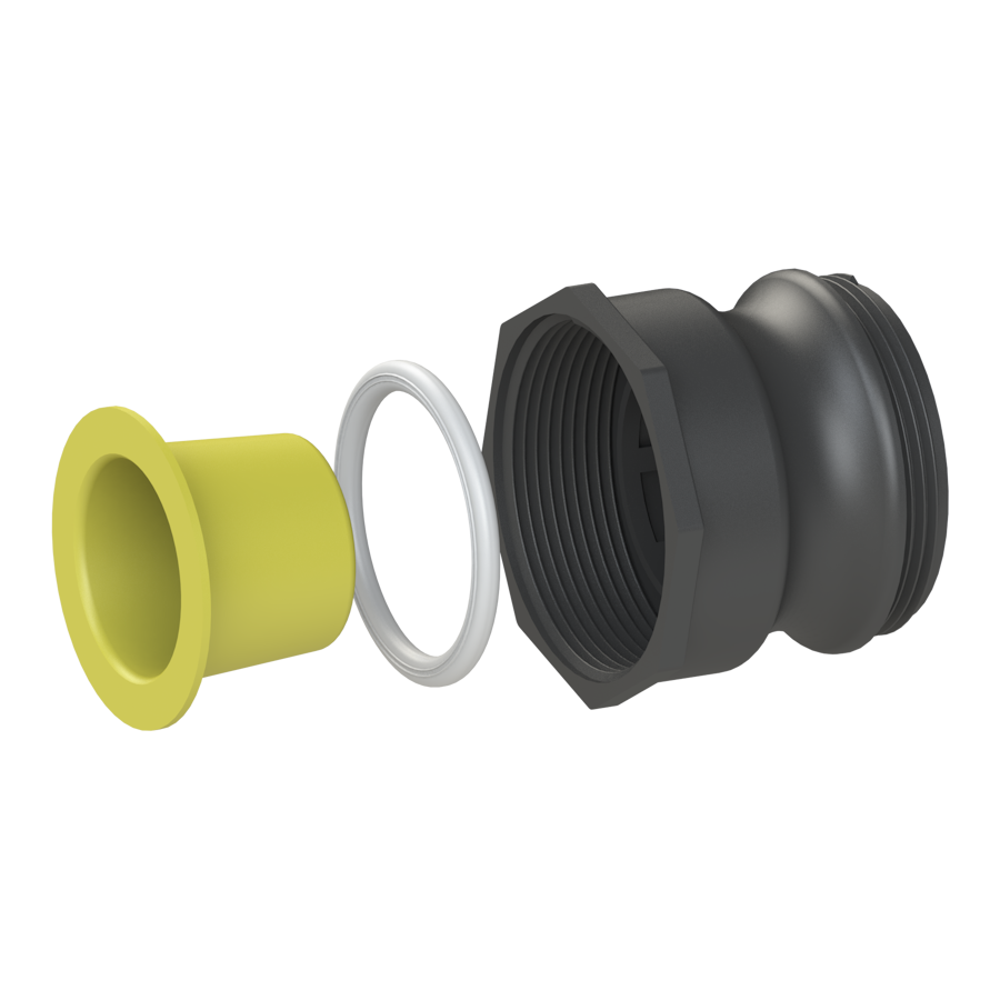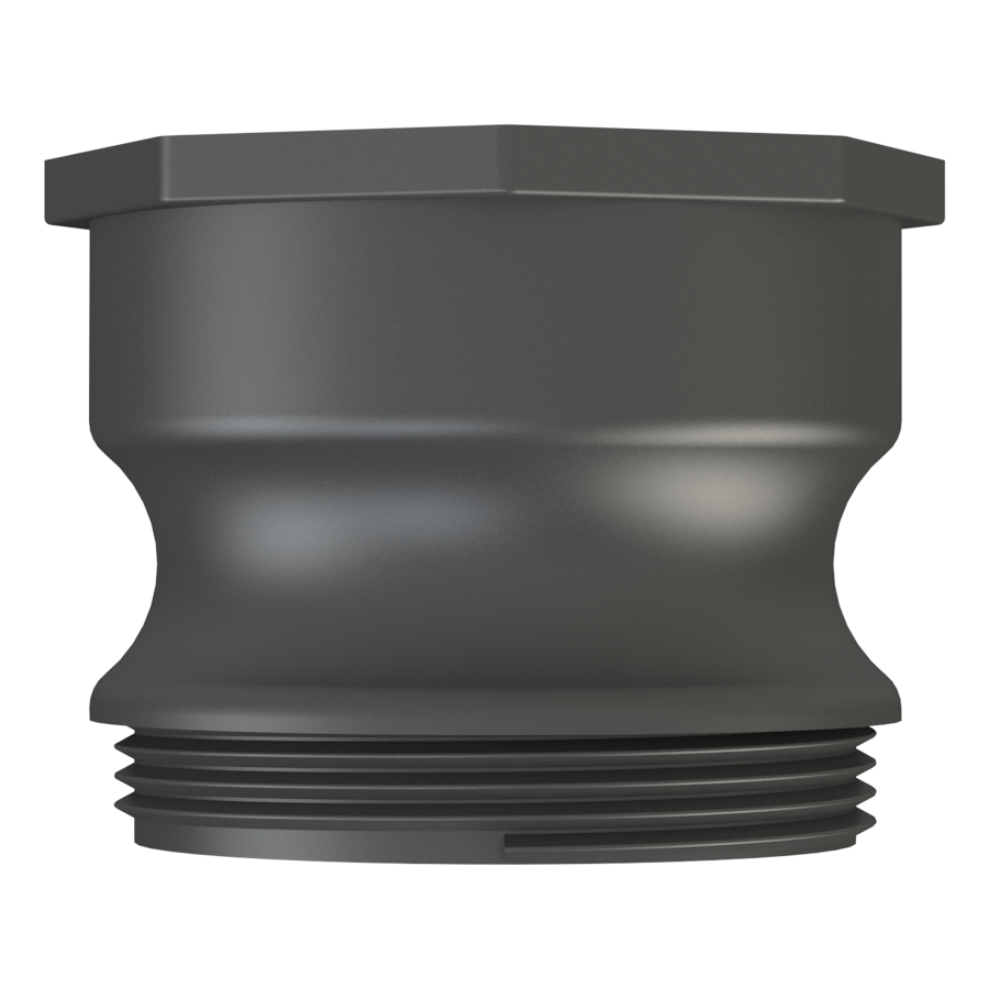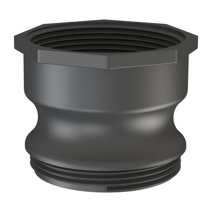 IBC tank valve adaptor, 2’’ Part ‘A’, 2’’ short Camlock with external 2’’ BSPP short male thread for attaching a low-profile female dust cap. The other side of the adaptor is a 2’’ NPS female fine thread with gasket seal and internal dust plug, the plug must be removed when you empty the IBC tote (tank), material is food grade polypropylene.