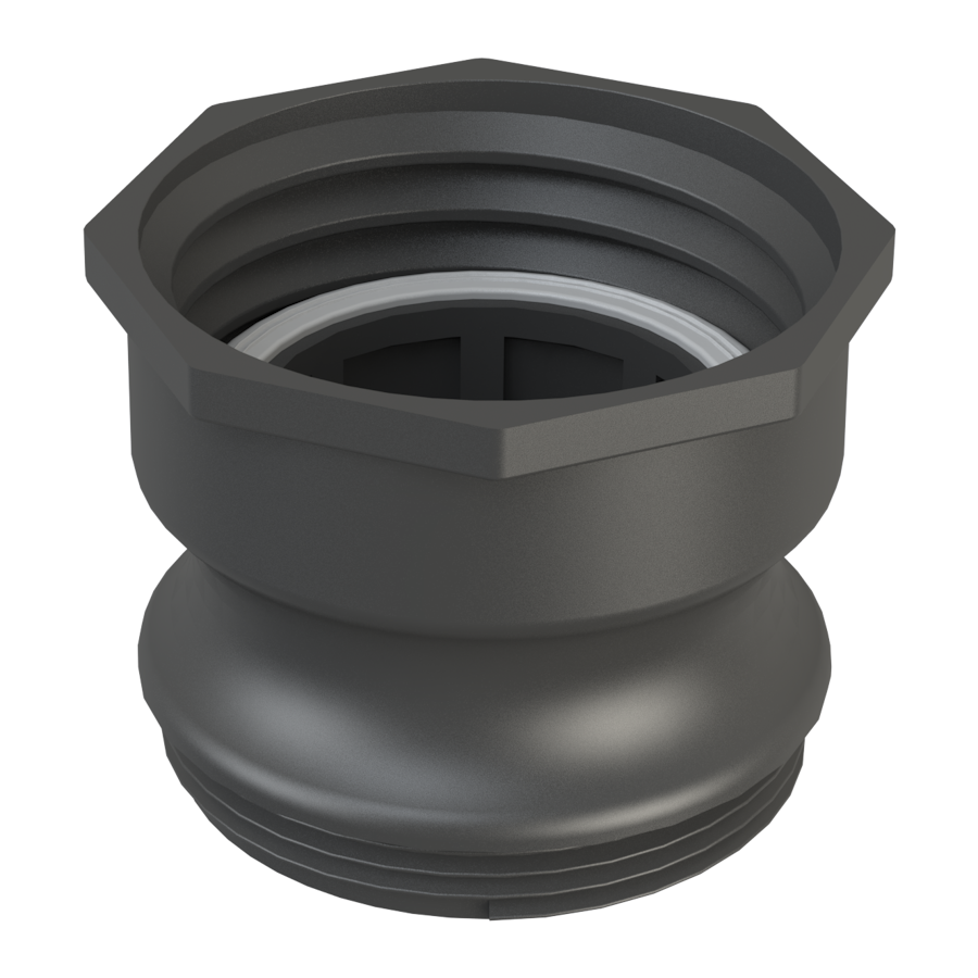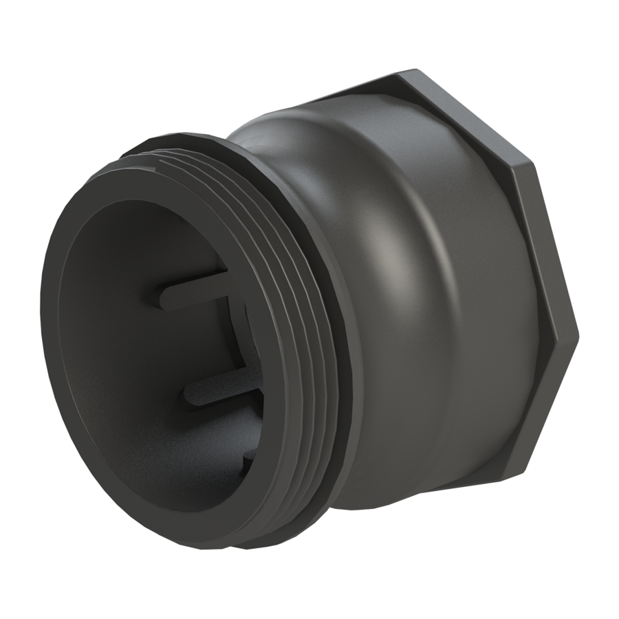 IBC tank valve adaptor, 2’’ Part ‘A’, 2’’ short Camlock male adaptor with external 2’’ BSPP short male thread for attaching a low-profile female dust cap. The other side of the adaptor is a S60X6 (2’’) female buttress thread with gasket seal, material is food grade polypropylene.